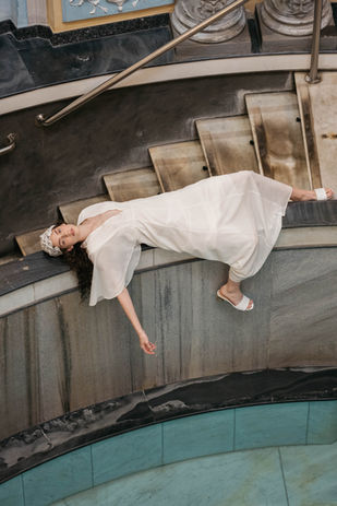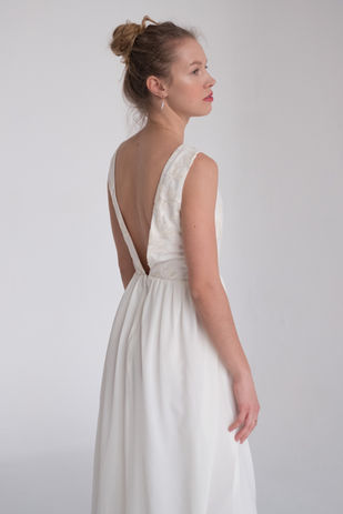 Rozkloszowana suknia z podkreśloną talią i długim dekoltem. Ozdobiona deklikatnymi rękawami na kształt motylich skrzydeł wykonana z żorżety wiskozowej lub jedwabiu.