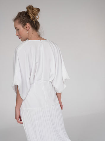 Krótka, lekka sukienka wykonana z ręcznie plisowanego szyfonu z kloszującym się dołem i ozdobnymi szerokimi rękawami